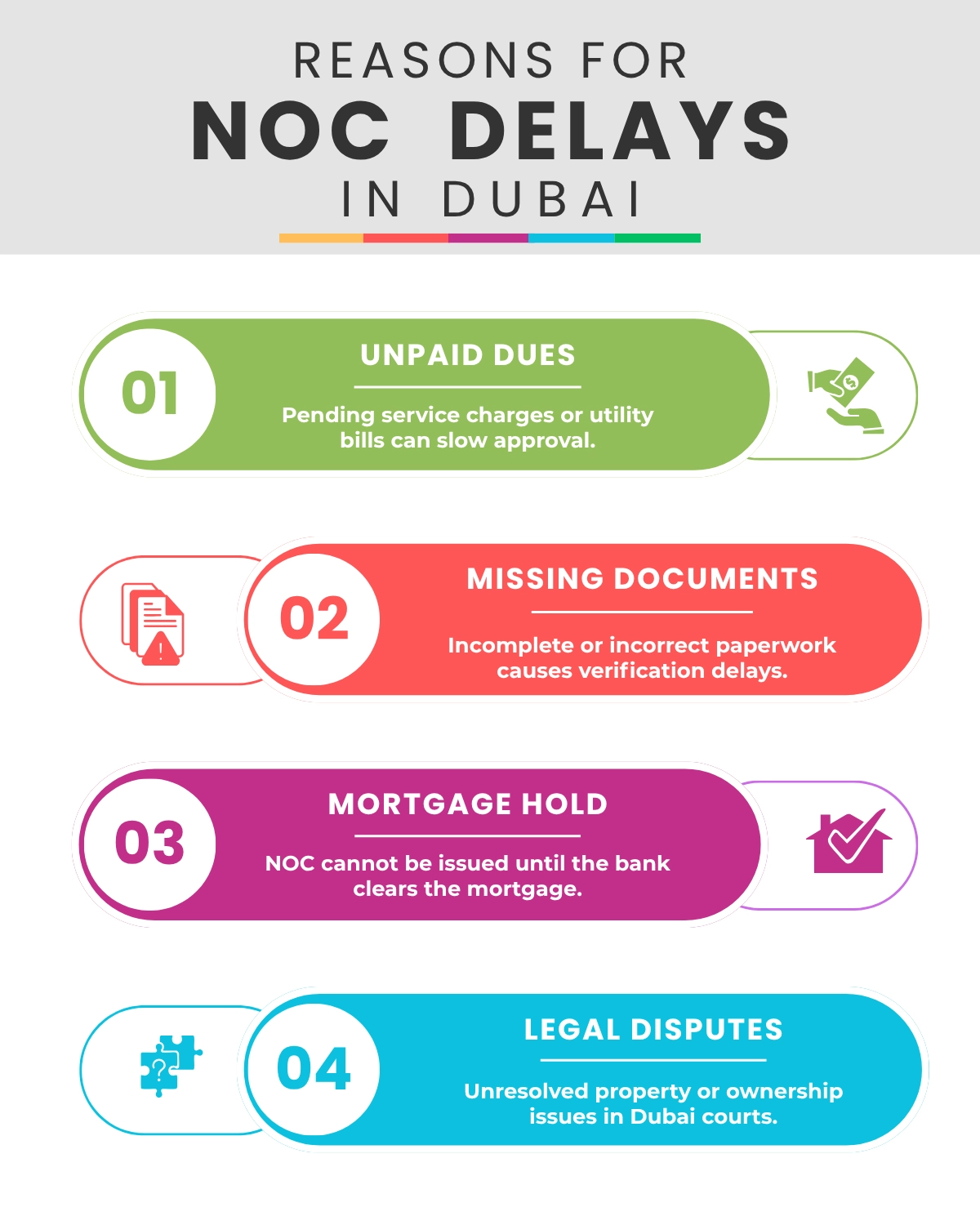 While the NOC issuance process in Dubai is generally smooth, delays can happen due to a few common reasons: